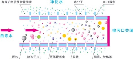 4、反滲透(RO):過濾精度在0.0001微米左右,是美國60年代初研制的一種超高精度的利用壓差的膜法分離技術。可濾除水中的幾乎一切雜質(包括有害的有益的),只能允許水分子通過。一般用于飲用純凈水、工業超純水、醫藥超純水的制造。反滲透技術需要加壓、加電,水的利用率低。